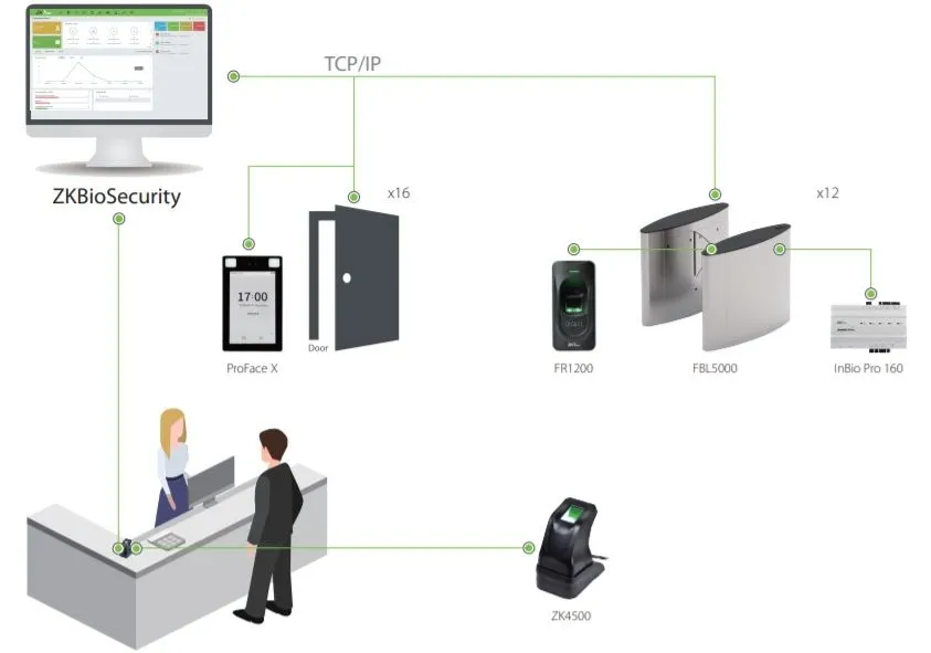 — Все терминалы и считыватели подключаются к контроллерам доступа InBioPro и централизованно управляются программным обеспечением контроля доступа ZKBioSecurity. Все статусы по контролю доступа можно просмотреть в любое время. Также возможно упрощенное создание отчетов.