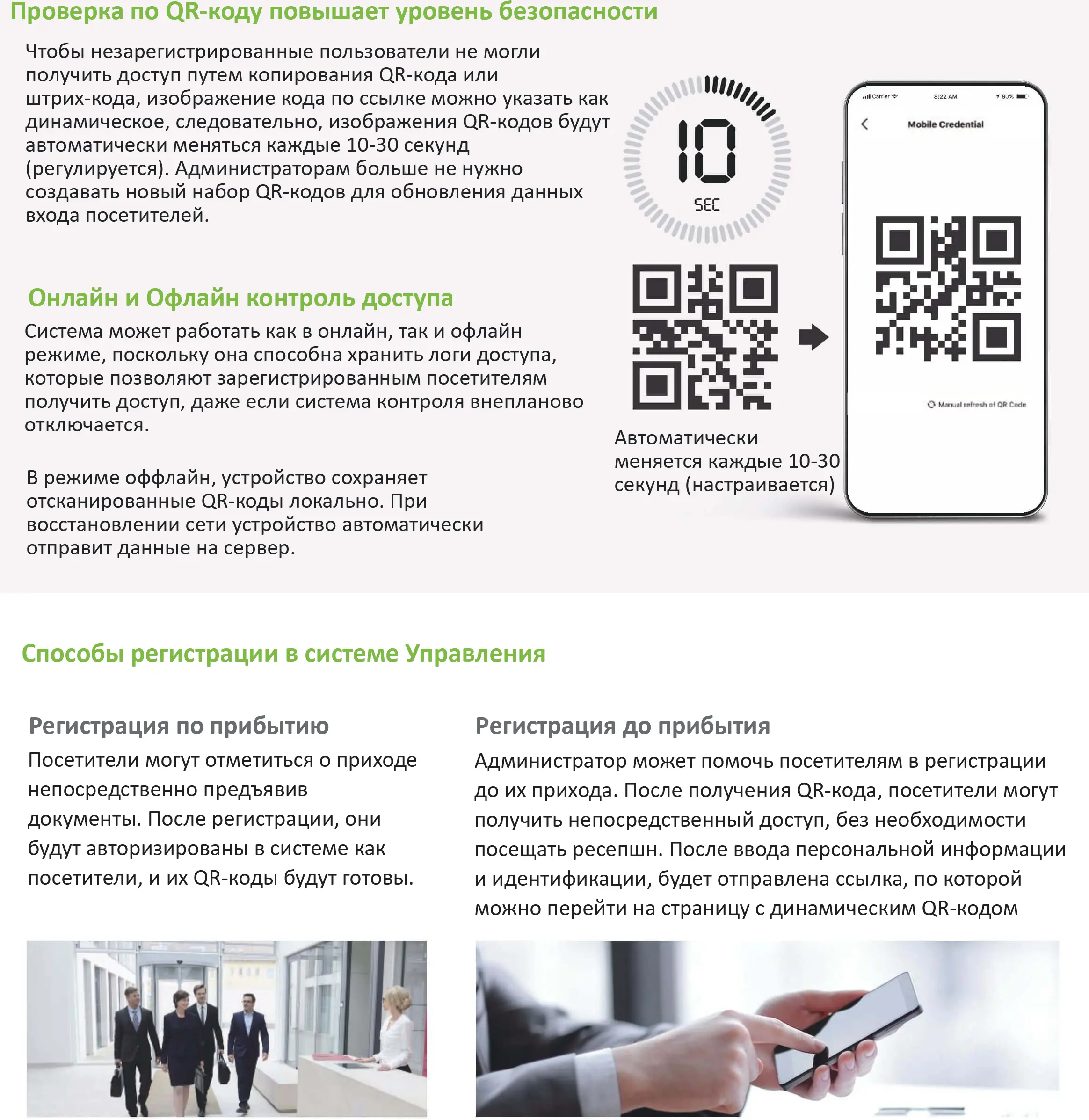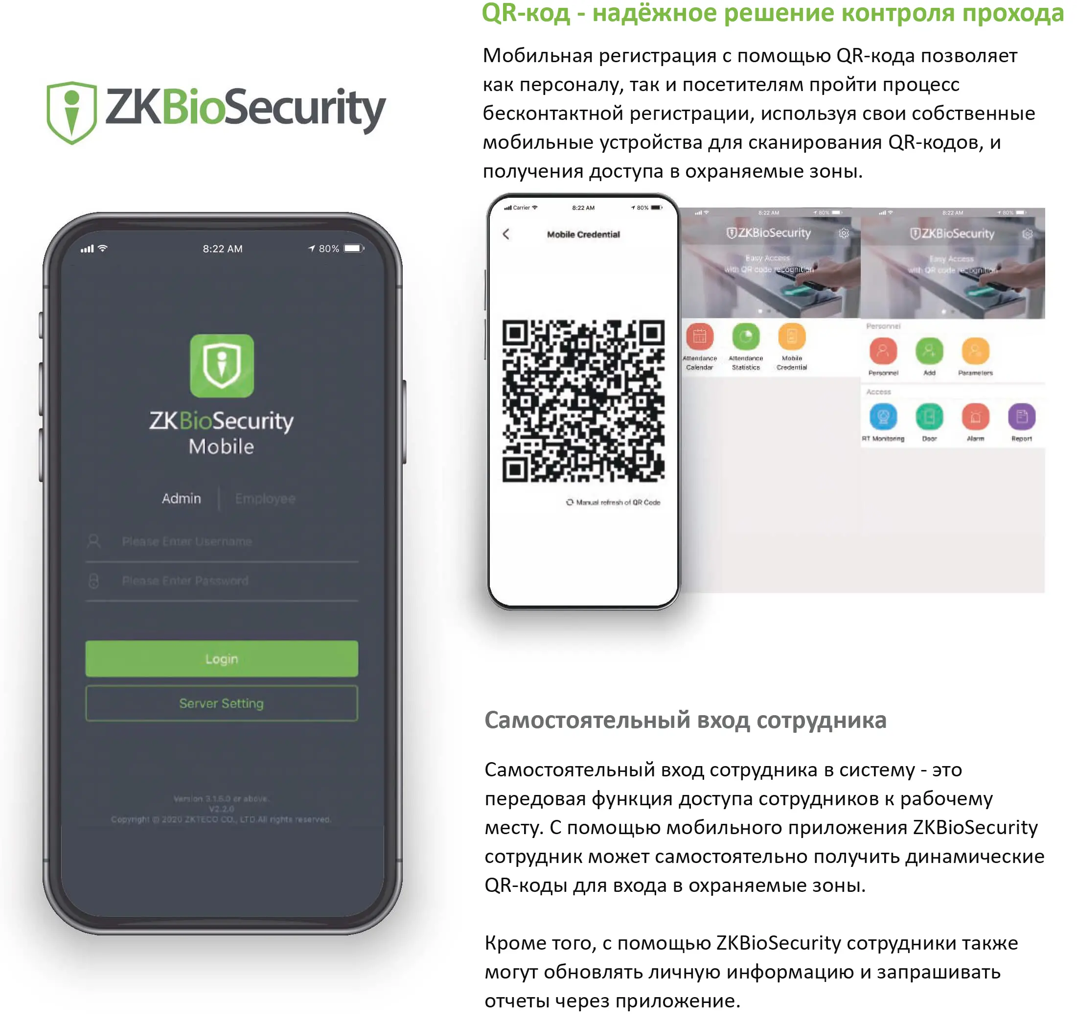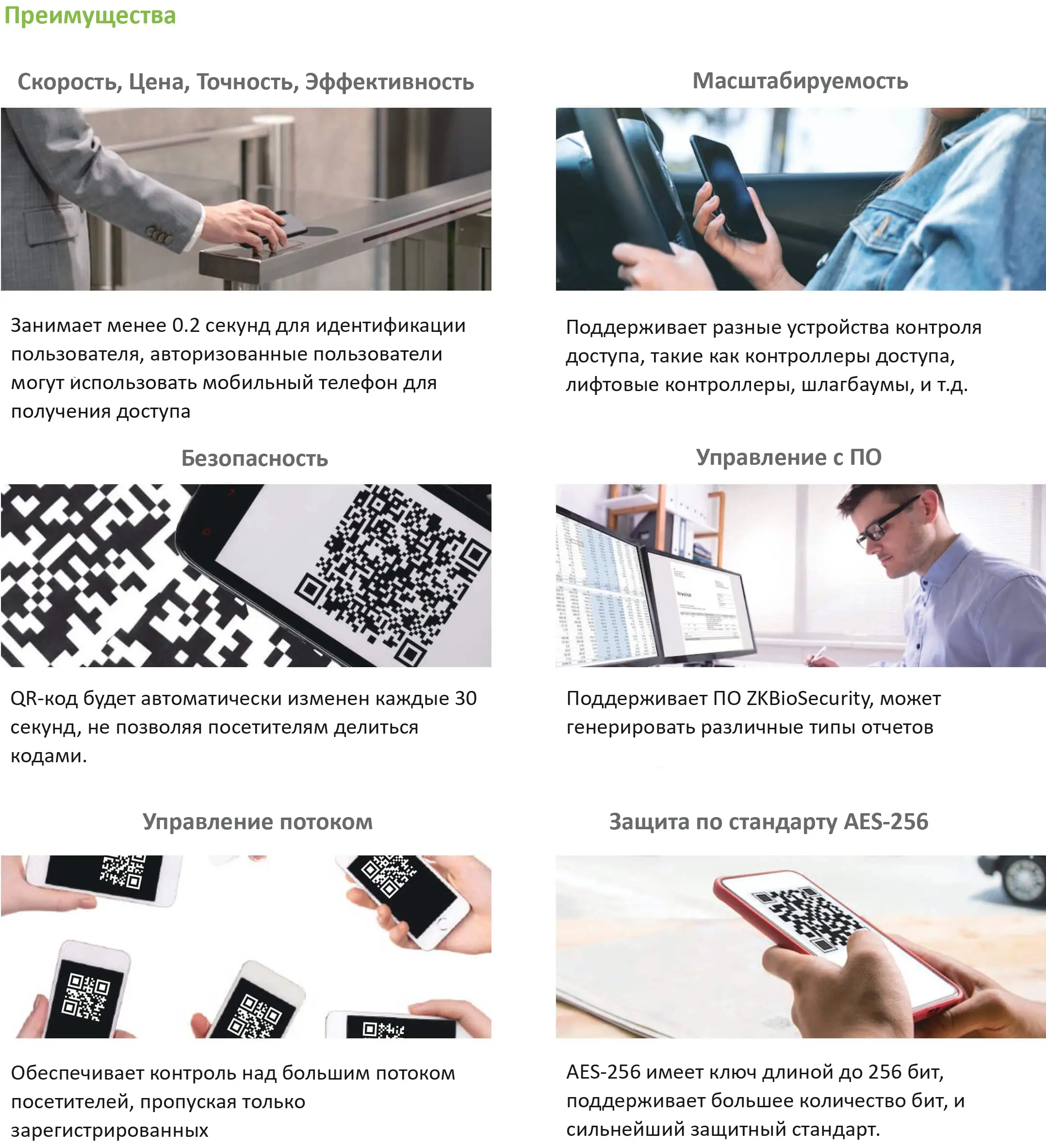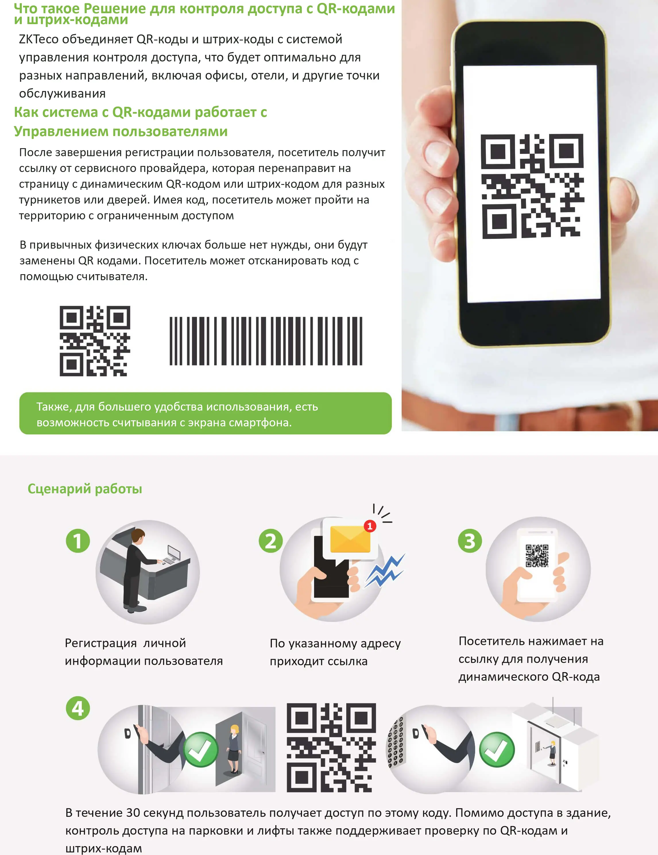 Недавно выпущенное решение от ZKTeco для управления доступом с помощью QR- и штрих-кодов обеспечивает простой, но эффективный контроль доступа. С помощью QR-кодов и штрих-кодов на мобильных телефонах, больше не нужны физические карты и ключи, а управление контролем доступа становится гораздо более простым, но и безопасным. Обладая множеством преимуществ в плане скорости, точности, безопасности, эффективности и рентабельности, решение идеально подходит для различных сценариев, включая офисные, гостиничные и другие служебные помещения