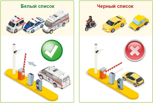 Программное обеспечение для управления парковкой включает в себя Черные и Белые списки. Автомобили предварительно занесенные в белый список, включая машины скорой помощи, полицейские машины и привилегированные автомобили могут бесплатно въезжать на парковку и выезжать с нее. Автомобили из черного списка не имеют права въезжать на парковку или выезжать с нее.