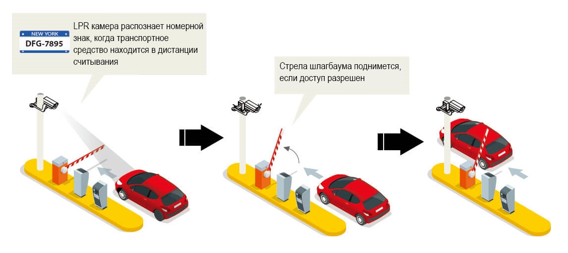 Технология LPR предназначена для распознавания компьютерного видеоизображения номерного знака автомобиля, цвета и другой информации. Идентификация начинается, когда транспортное средство находится на въезде в парковку, камера LPR сканирует символы автомобильного номера, а технология распознавания определяет номерной знак, цвет и другую информацию. Если номерной знак зарегистрирован в базе данных, то шлагбаум поднимется для пропуска, в противном случае, доступ будет запрещен.