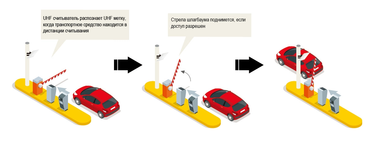 Распознование начинается, когда пользователь с RFID меткой проезжает через UHF-считыватель, расположенный у въезда на парковку. Считыватель UHF распознает тег. Парковочный барьер поднимется при условии, что тег зарегистрирован и уровень доступа позволяет ему совершить Вьезд/Выезд. Если нет, доступ будет запрещен.