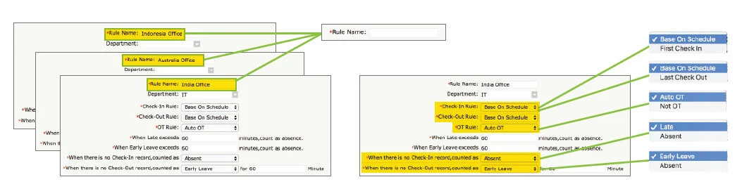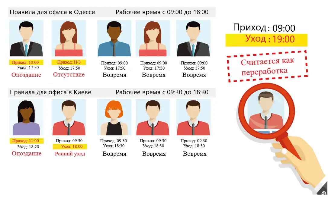 Biotime может устанавливать различные правила посещаемости, применимые как для всей компании, так и для любых отделов.