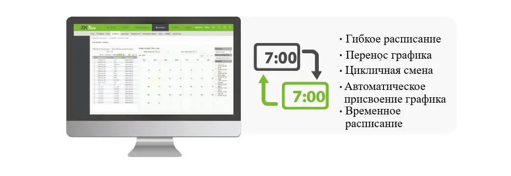 ‧ Гибкое расписание рабочих смен и автоматическое присвоение графика работы