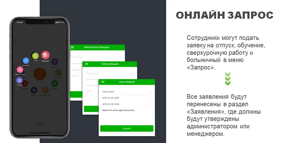 у відпустку, лікарняний лист, подати заявку на зміну розкладу. Просто відкрийте додаток BioTime, перейдіть до
