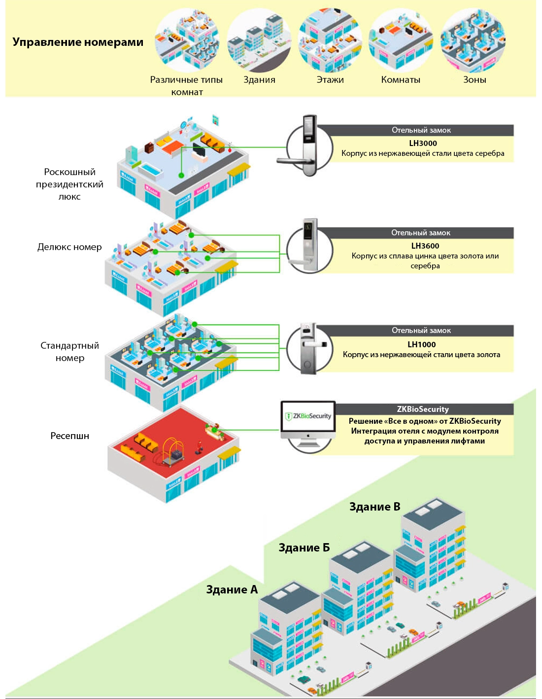 Модуль управління готелем ZKBioSecurity спеціально розроблений для задоволення потреб малих і середніх готелів, що забезпечує максимальну безпеку, індивідуальний стиль і низькі експлуатаційні витрати. Система управління готелем дозволяє здійснювати всебічний контроль доступу і управління системою. Span> p> Основні особливості strong> span> • Веб-серверне рішення для управління готелем span> p> • Повна інтеграція з модулем контролю доступу та ліфта в комплексному вирішенні ZKBioSecurity •Реєстрація, виписка і бронювання для гостей готелю span> p> • Створення карт доступу до індивідуальних функцій для зручності управління системою: для адміністратора, для гостей, для обслуговуючого персоналу та інших співробітників span> p> •Створення Карти Записів, для отримання інформації про вхід / вихід через готельний замок span> p> • Графічний інтерфейс програми дозволяє переглядати зайнятість номерів і присутність гостей в номері span> p> • Управління оплатою гостями номерів готелю span> p> • Звіт про використання номерів формується автоматично системою span> p> • Редагування шаблонів друку для персоналізації ваших документів Управління ліфтом відповідно до правил контролю доступу Доступ гостя до поверху в залежності від його рівня доступу Активація модуля управління ліфтом і контролем доступу, на додаток до модуля управління готелем, дає ряд переваг і зручностей. Завдяки системі управління ліфтом від ZKTeco неможливо привласнити картку гостя доступу на певні поверхи вашого готелю. Для того, щоб гостю піднятися на поверх, необхідно перед вибором поверху прикласти карту, видану на ресепшені, до зчитувача в ліфті, контролер ідентифікує користувача і відповідно до його прав доступу, дозволить досягти потрібного поверху. У комплексі це підніме контроль доступу вашого готелю на абсолютно новий рівень. Готельний номер має інтуїтивно зрозумілий інтерфейс, яким легко керувати, навіть без читання span> інструкції. Система використовує технологію Зчитування / записування RFID карт для забезпечення гостям необхідних прав доступу, із зазначенням дати і часу дії, для їх комфортного перебування в готелі. Просто натисніть в ZKBioSecurity span> на номер кімнати в якій гість хоче залишитися і він отримає доступ до призначеного номеру в межах обраної дати і часу. Веб-серверна платформа для управління реєстрації гостей span> b> span> p> Управління ліфтом дозволяє гостю зупиняти ліфт в певний час і використовувати, якщо доступ дозволений до ліфта і якщо є бронювання номера. Наприклад, щоб забронювати номер в готелі і ліфт, персонал готелю просто клікає на відповідну дату і час за допомогою програмної веб-платформи ZKBiosecurity. Звіт про загублену картку Гостям видається карта доступу до номеру при реєстрації на ресепшені. Якщо гості втрачають свою карту доступу, персонал готелю просто використовує функцію «Повідомити про втрачену картку» і створює нову карту, щоб замінити втрачену карту. Проведіть новою карткою по дверному замку. Замок активує нову карту і видалить дані втраченої / викраденої картки з пам'яті. Вдосконалені функції Оплати Послуг span> b> span> p> Гостям готелю часто доводиться здійснювати платежі готівкою або кредитами. ZKBioSecurity пропонує варіант оплати наданих послуг гостю при виїзді. Просто пред'явіть свою карту доступу при оплаті в залах готелю, кафе або ресторанах.