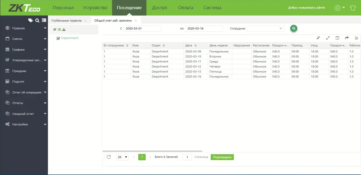 Основная задача BioTime 8.5 — учет рабочего времени и как дополнительная функция, также присутствует модуль контроля доступа. В программном обеспечении вы можете создавать разнообразные отчеты по отработанному времени, а так же просматривать объем заработной платы начисленной сотруднику по итогам отработанного времени. Мобильное приложение BioTime позволит вам контролировать пользователей, просматривать отчеты, а так же отмечаться с помощью мобильного телефона для учета рабочего времени.
