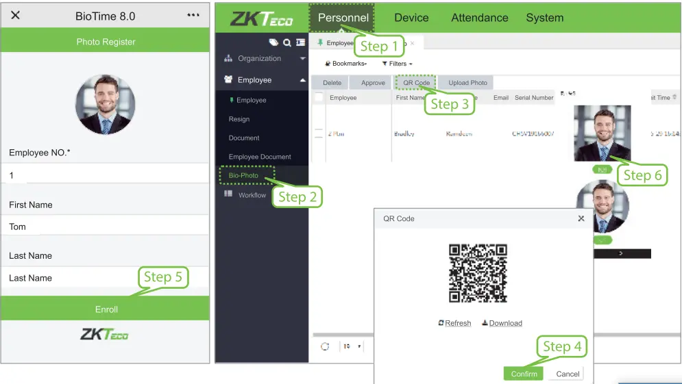 Терминал способен хранить в своей памяти до 6000 пользователей. Регистрировать пользователей можно как с помощью ПО на компьютере, так и с помощью мобильного телефона. Процесс происходит все так же: вы можете загрузить готовое фото пользователя или же сфотографировать человека с помощью мобильного телефона или web камеры. Удобная функция в BioTime 8.5 позволит отправить пользователю QR-код для регистрации персональных данных в программном обеспечении. При сканировании QR-кода открывается окно в браузере, где пользователь может прикрепить свое фото, заполнить поля с информацией о себе. Добавить пользователя возможно и на самом терминале.