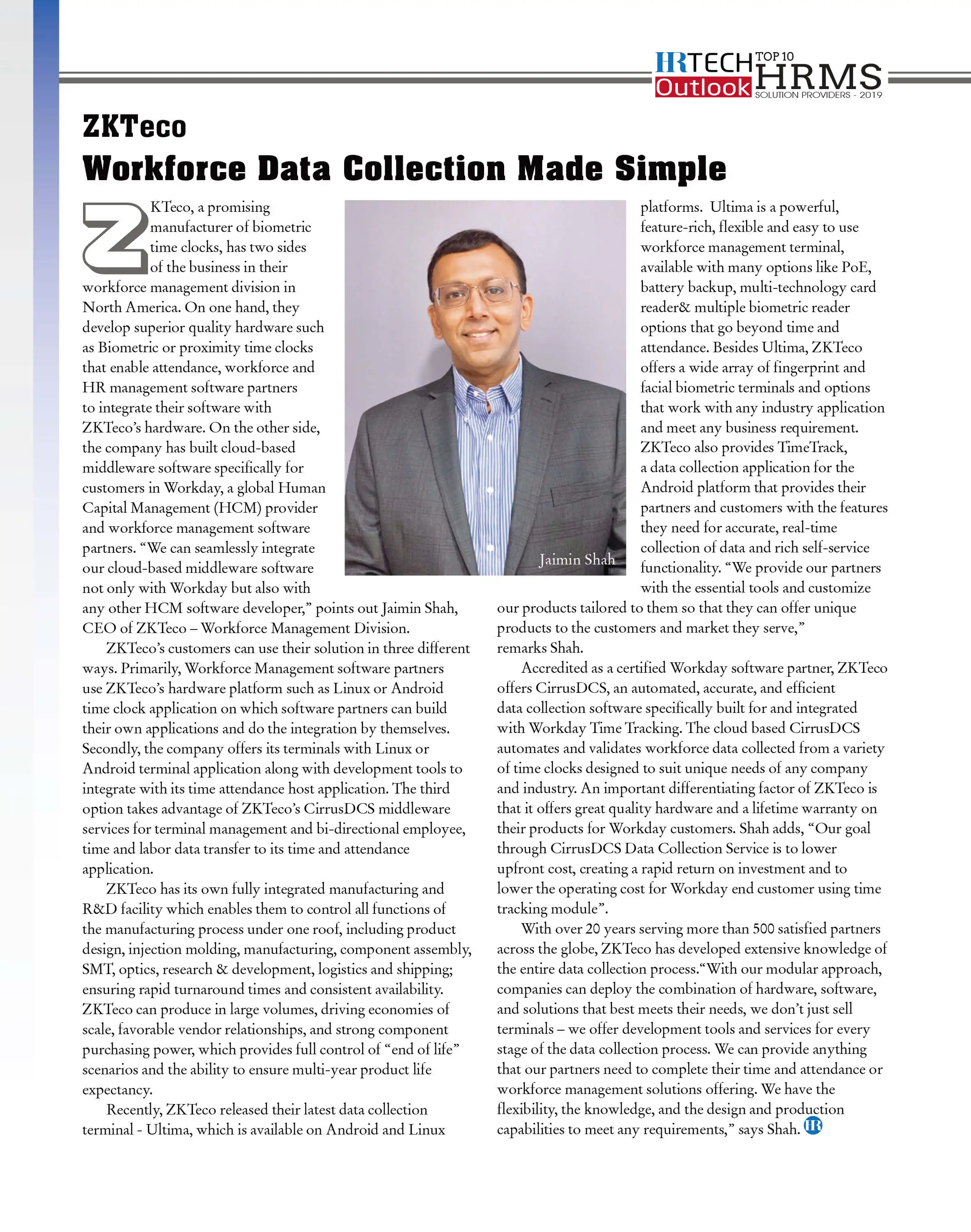 верификации, как отмечает Джаймин Шах, генеральный директор ZKTeco USA - Workforce Management