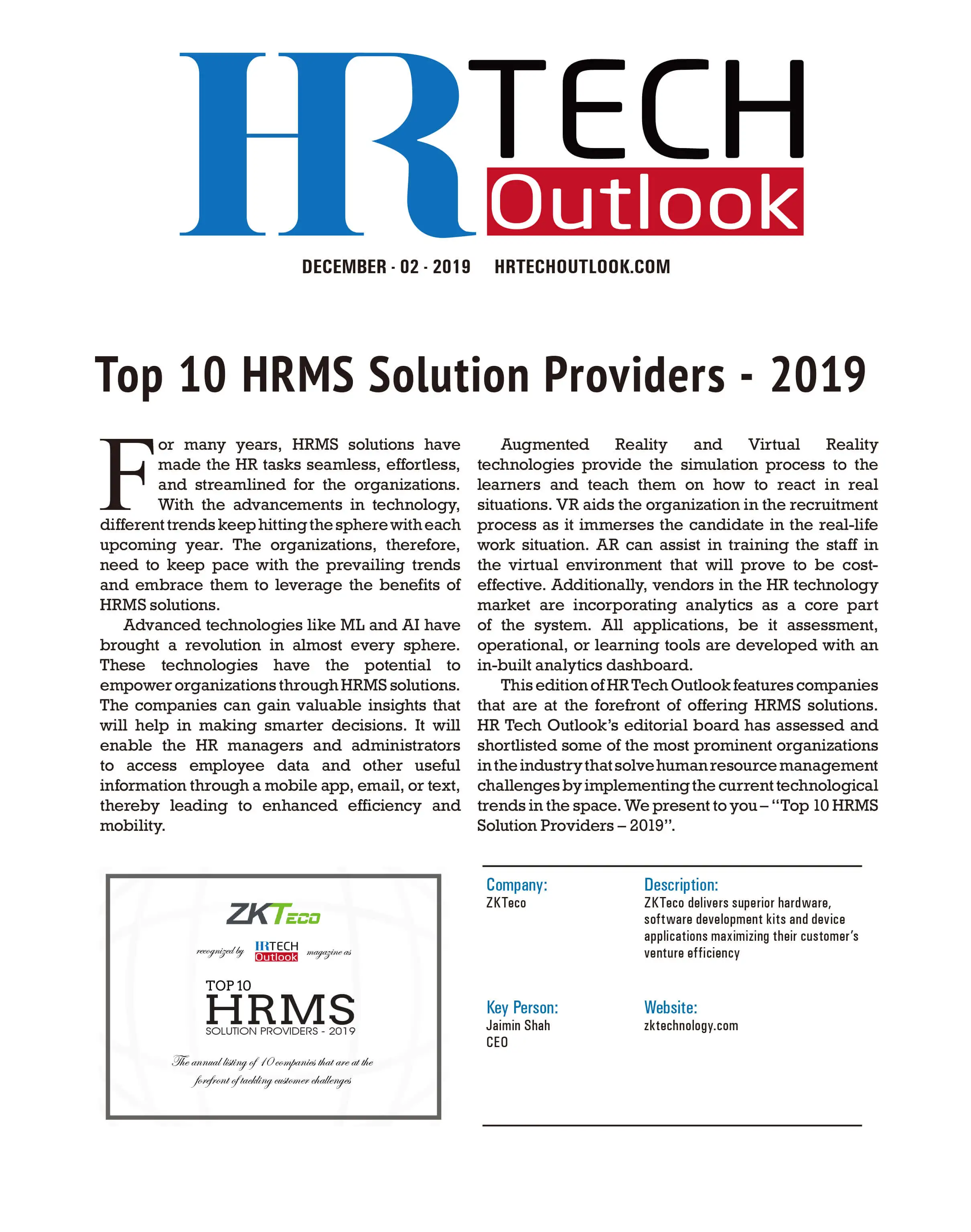 ZKTeco входит в десятку лучших поставщиков решений HRMS по версии HR Tech Outlook 2019